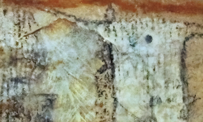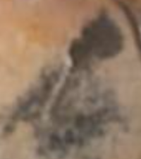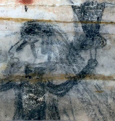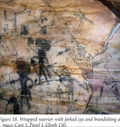 See the pointy snout and ears of a black wolf staring at you on the sirian/greek pirate's stick? His other hand brandishes a sword at a white lady's face in this scene of attack from Picture Cave, Mo. by Finger Lakes State Park and Eden of LDS. Called a glove in article on cave but look.