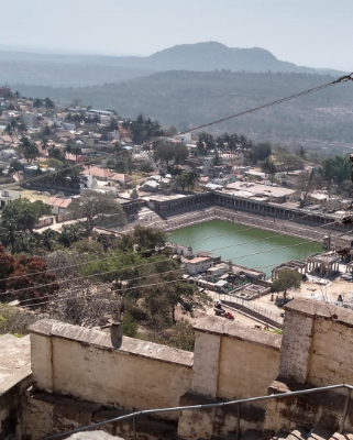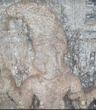 See the distinct conehead outline of the profile of the lithified fallen hero Hanuman in my photo from Melukote, south India. It is a place loaded with sacred ghats. Below is my photo of a less epic monkey faced conehead from a pool temple.