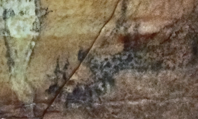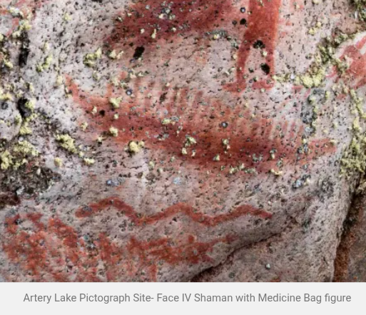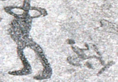 A little cranial sacral balancing to prep for the big event? Mishipeshu receives EMF with her horns then transmits current into Akluhti who glows. See the E for EVE in the crossed legs of the lynx? 'Experts' see bowl offering and naming ceremony?! (Thanks to M. Fuller for Dstretch Images.)