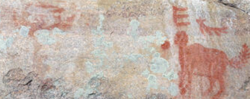 Zoom in of ant eyed grey-like conehead Isis in Abuela form (Spanish for Grama, code word for ET) or bat demon form threatening a smiling EVE as she escapes the horned devil's or naga shiva's hell. Art is northwest of Great Lakes, Canada. Same E for tribrid EVE also seen on Aladdin's Lamp handle and Akluhti dog & dolphin below. Terraformed by EMF sisus such as negro coneheads wield at both EVE sites by Finger Lakes of Mo. and NY. Akluhti reveals EVE as a Sirian hybrid (dad Enki is son of Orion lion king & Sirian Isis so EVE is 1/4 sirian). Head is on caribou body though they were hunted out centuries ago. Suggests 'cherub' as on Arc of Covenant meaning a transmitter or receptor of EMF.