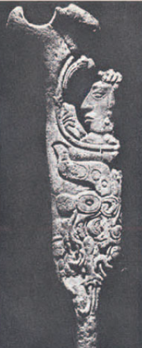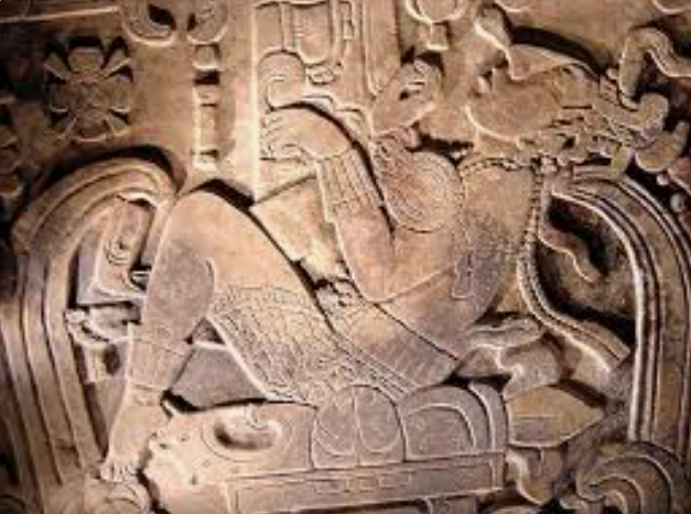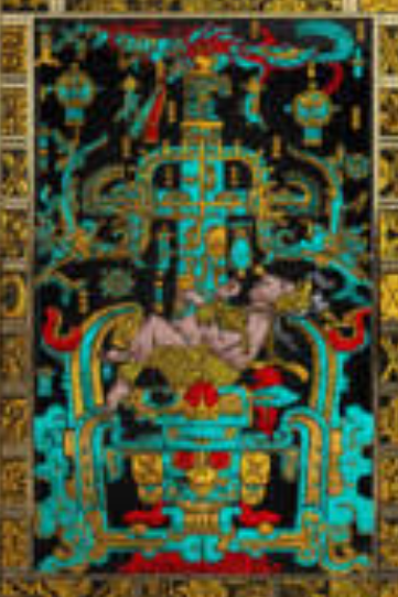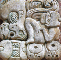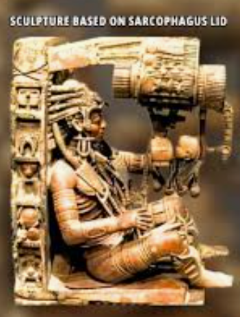 Mayan glyphs, head from Tikal museum, coffin lid from Palenque shown at bottom also depict men in helmets or ufo's.