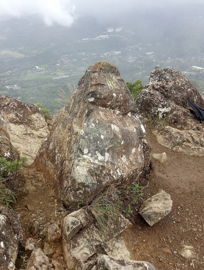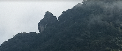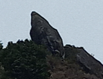 The Abuela at La India by Panama's Machu Picchu, a smooth black fossilized humpback whale with eroded hump that is our nose as my 5 pix show. Way up on mountaintop and I got lost in jungle so no good close up. Seems to have beak with serpent in it, tailed monkey hanging on at side. Very different than the Abuela I found atop Piedra del Musgo in Boquete with its arms and tray broken off. The hilltop there looks like a lithified dino with clubbed tail. Hit by lightening or an EMF weapon in battle against ore ions.